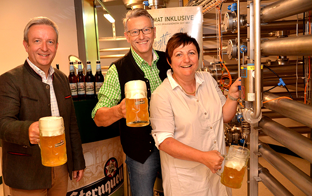 Bt: Im Bild von links: Die Sternquell-Geschäftsführer Jan Gerbeth und Günther Spindler haben Bürgermeisterin Kerstin Wolf zur Zwickelbierverkostung in die Heimatbrauerei eingeladen. Foto: Sternquell-Brauerei